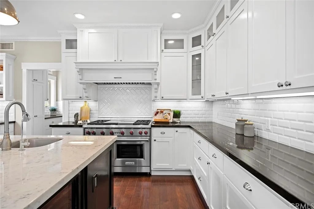 Features of this unique custom-built home include an open living room, formal dining room, and abundant built-in cabinets. Wainscottings, recessed lighting, hardwood flooring, and dual pane windows throughout. The Gourmet kitchen with open floor plan, white Carrera Marble countertops, an oversized center island, and eating area. High-end quality appliances including 48′ Wolf range, a Sub-Zero refrigerator.